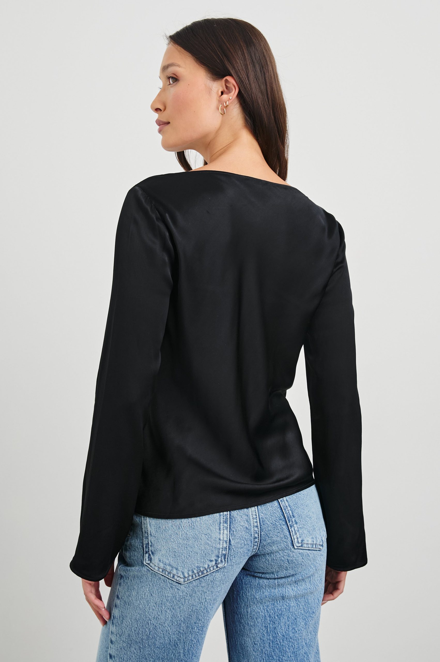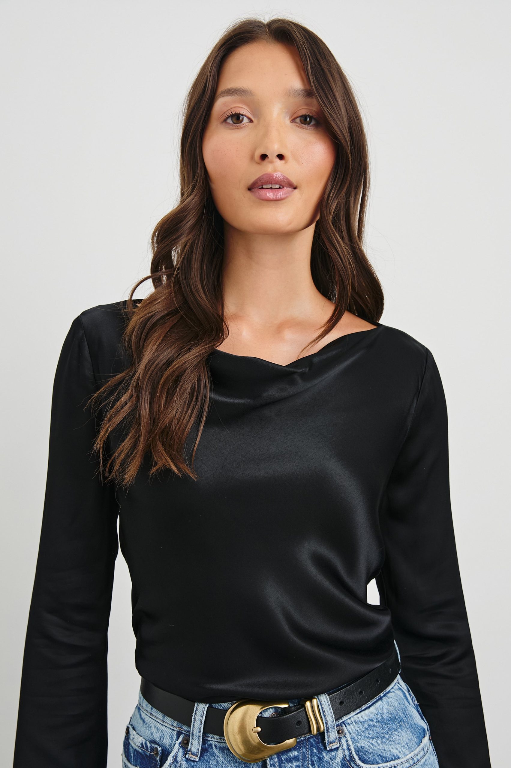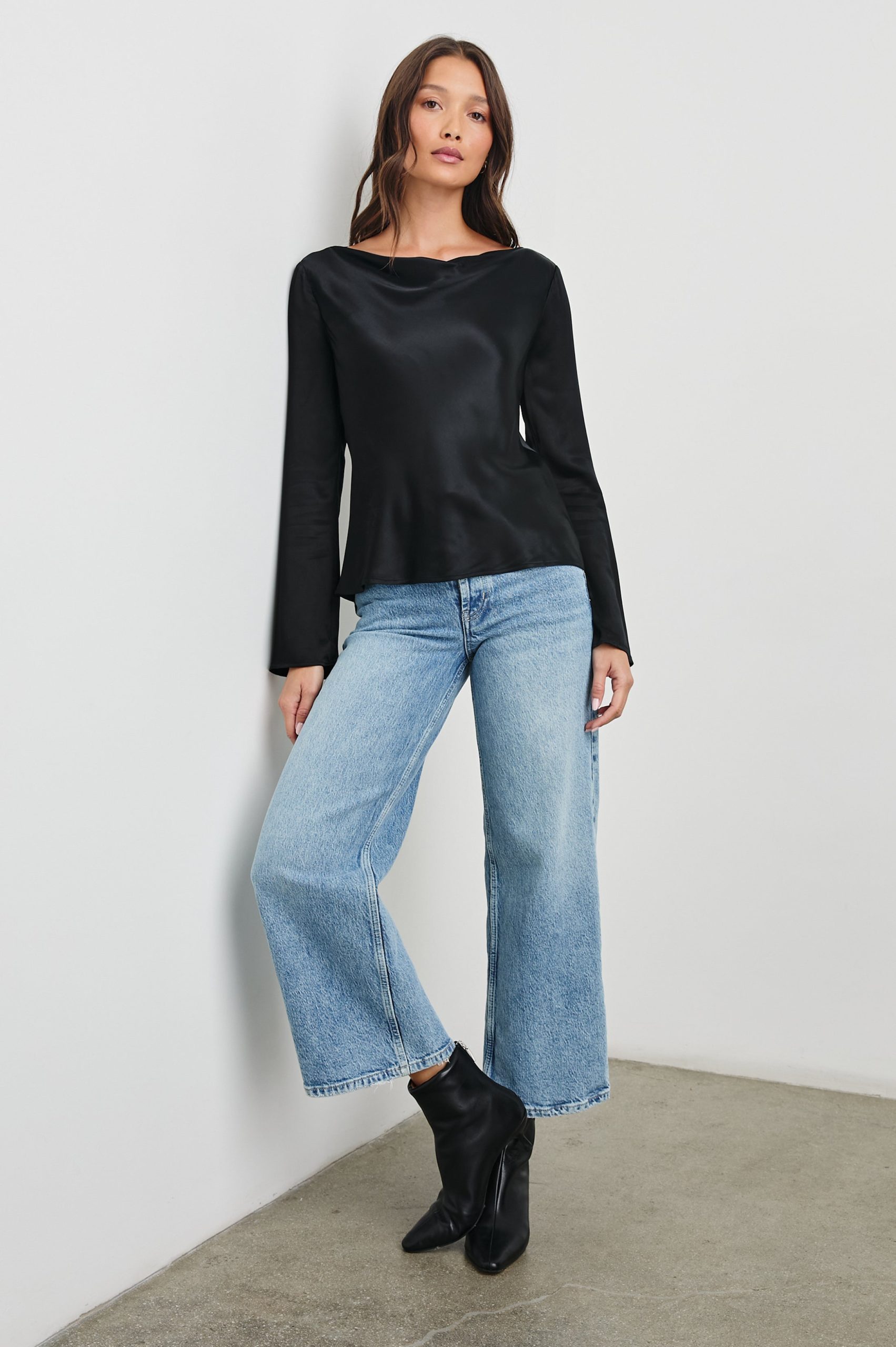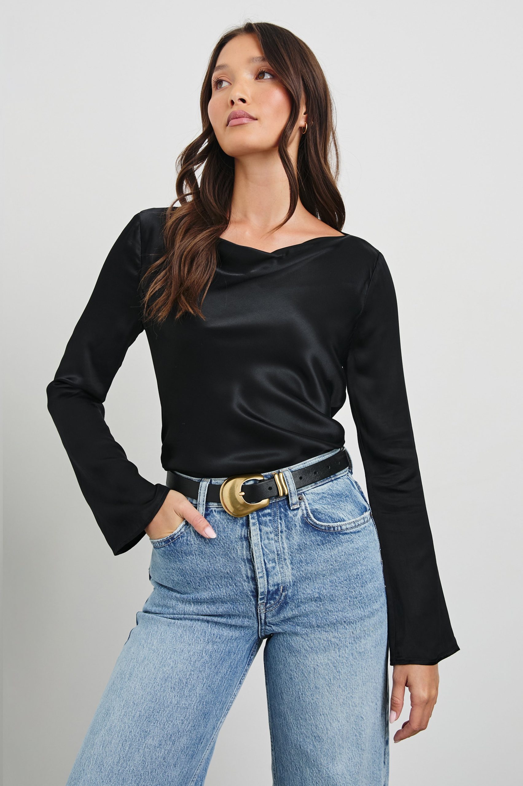 With a boat neckline, flared sleeve, and luxe satin fabrication, the Amari is a sophisticated staple designed to be worn year-round. Dress up your denim or match it with a satin midi-skirt.