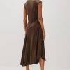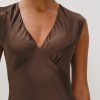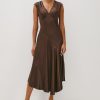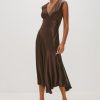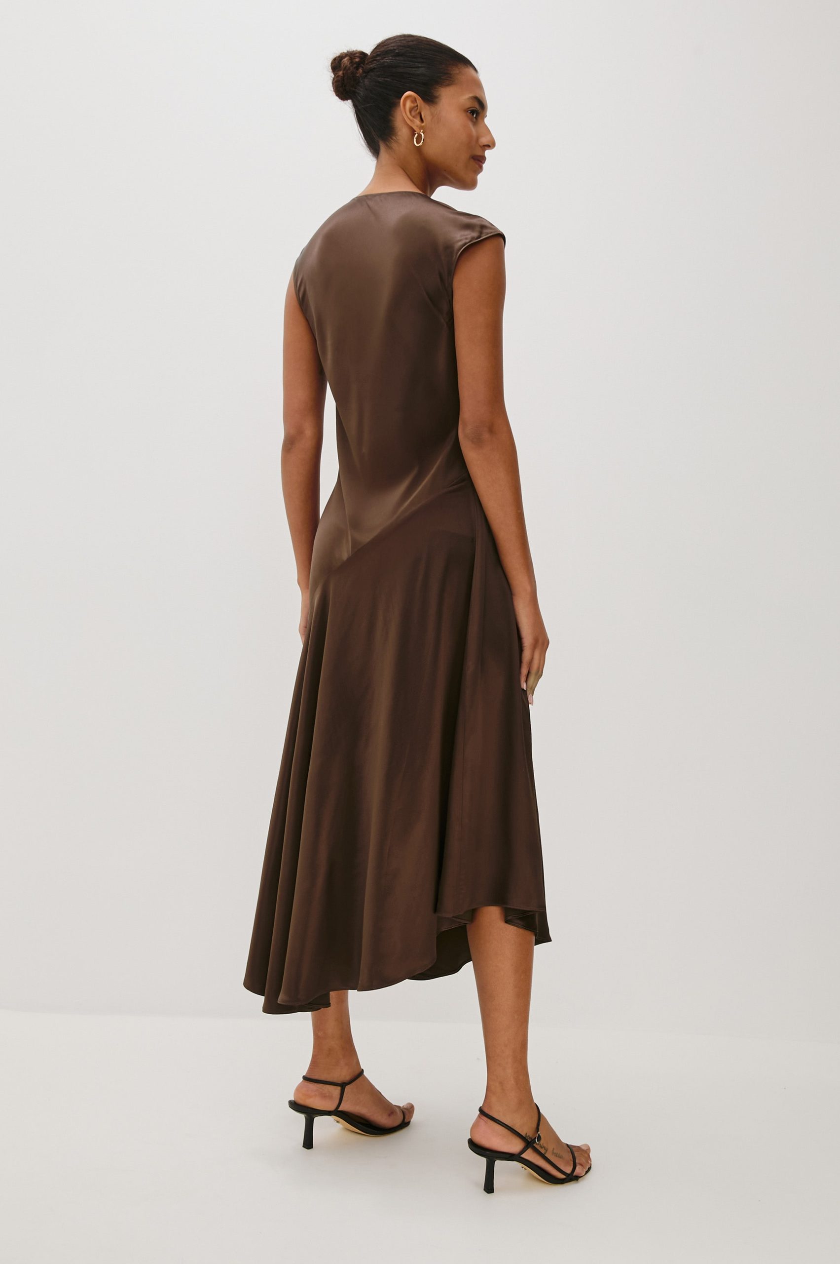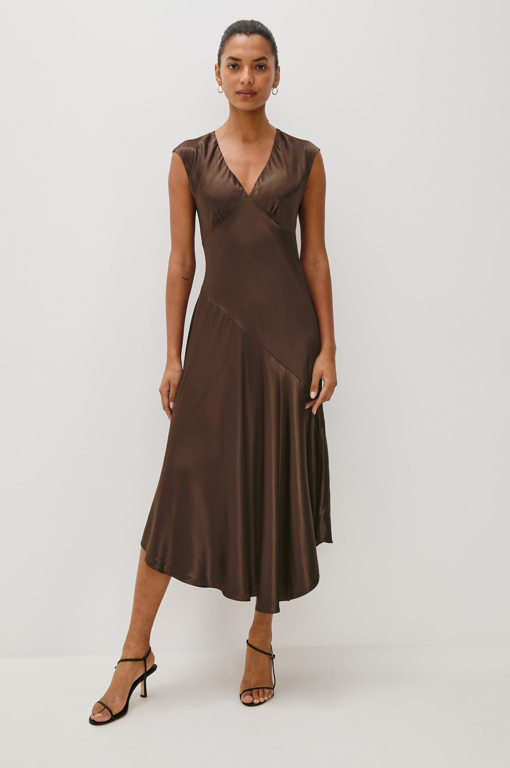 The Eleni midi dress stuns in satin crepe, with cap sleeves, elegant shirring details, and an asymmetrical skirt.
