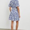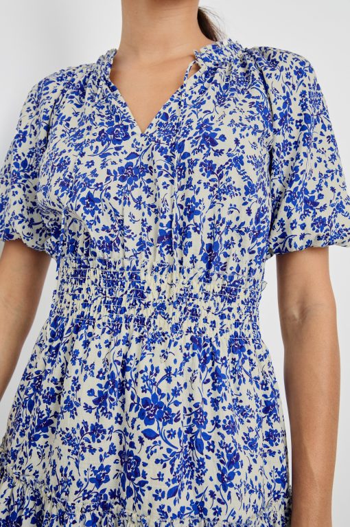 The Fiorella is an airy mini dress crafted from lightweight crinkle chiffon. It features subtle peplum sleeves, a plunging v-neckline, and a shirred waist that flows into a lined, tiered skirt.