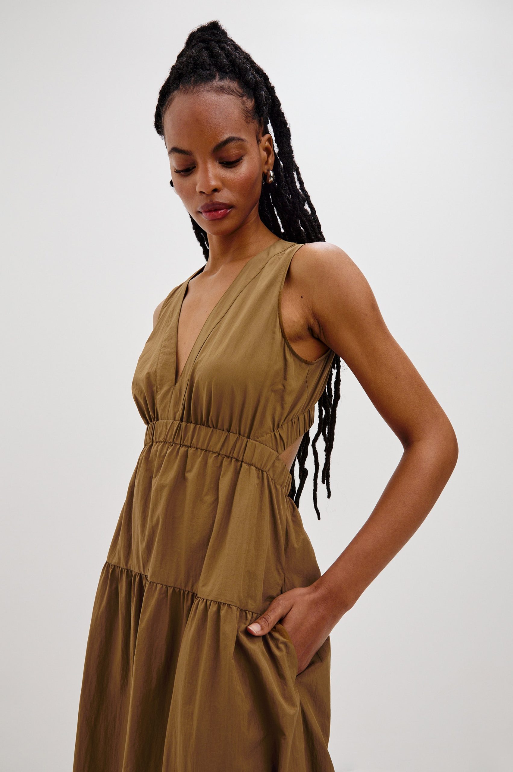 The Genevieve maxi dress is designed for effortless wear, featuring a flattering A-line fit and a cut-out detail at the back.