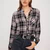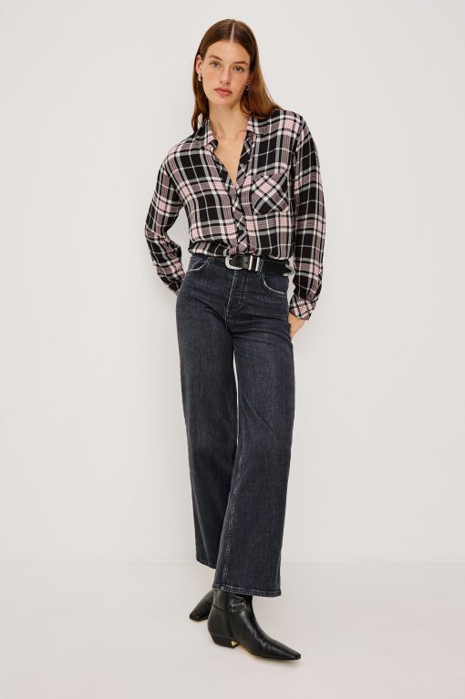 The Hunter Shirt is our signature button-down shirt that works for day, night, and even better, the weekend. Its unique fabric is spun from an incredibly soft rayon that hangs beautifully without any effort. This particular style features a black, white, and pink plaid print. Perfectly relaxed with a classic fit, it can be tucked, tied, or left open.