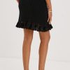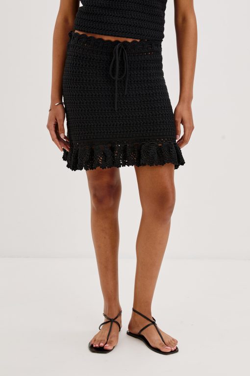The Kaylie is a fitted mini skirt in a pull-on silhouette—crafted from a high-quality cotton crochet knit and finished with a flutter hem.