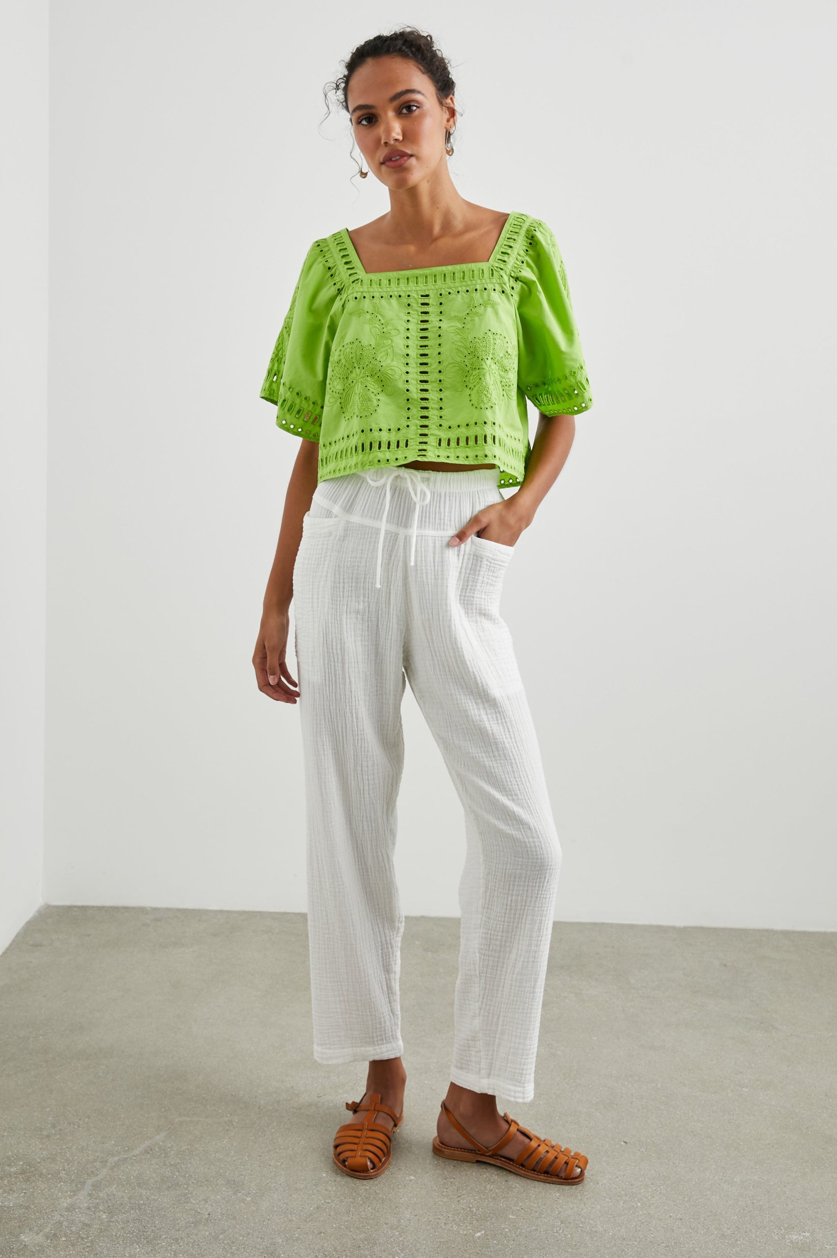 Unique yet versatile, the Laine top is ready for an island getaway, brunch down the block, and everything in between. Made from crisp cotton poplin and complete with wide short sleeves, a square neckline, and dainty eyelet cutouts.