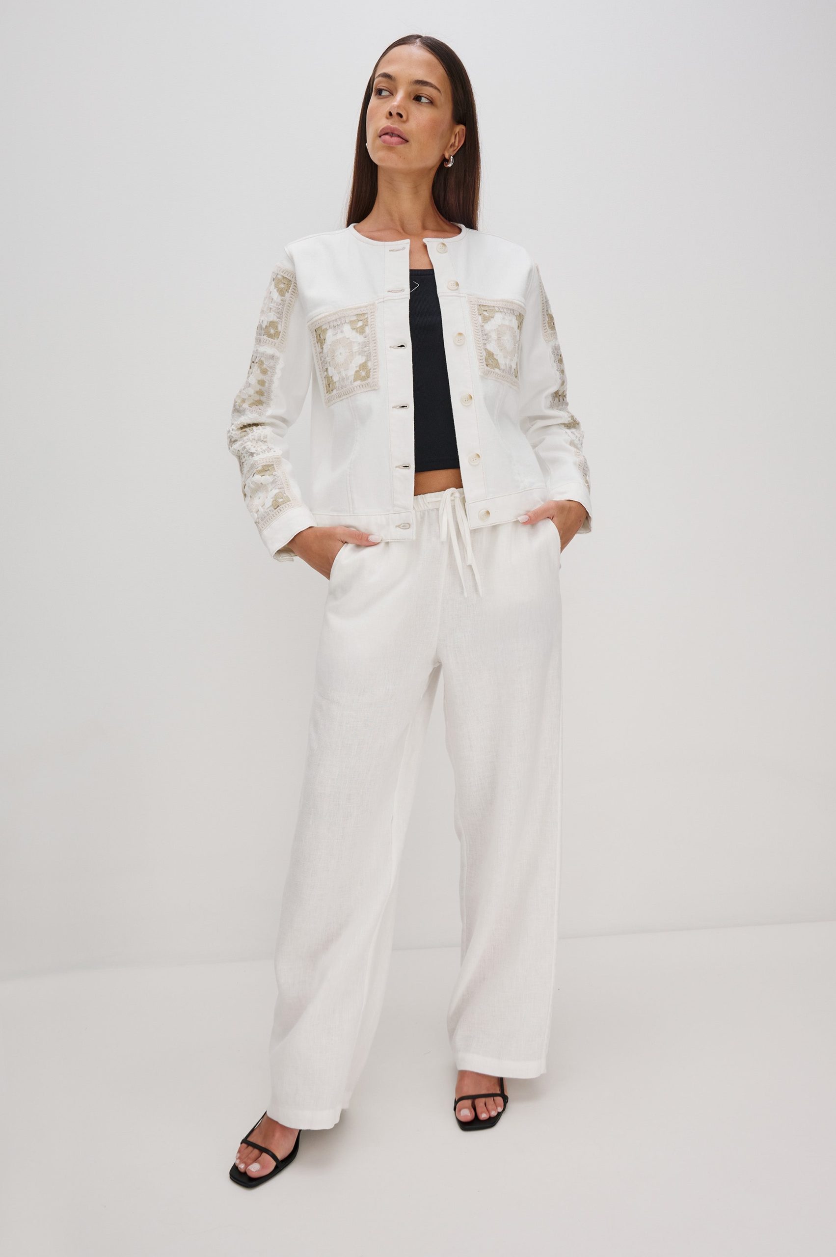 A 100% cotton collarless ‘lady’ style jacket with a cropped, boxy fit. Finished with crocheted detailing, patch pockets and statement seams, the Lido updates a denim classic with ultra-feminine details.