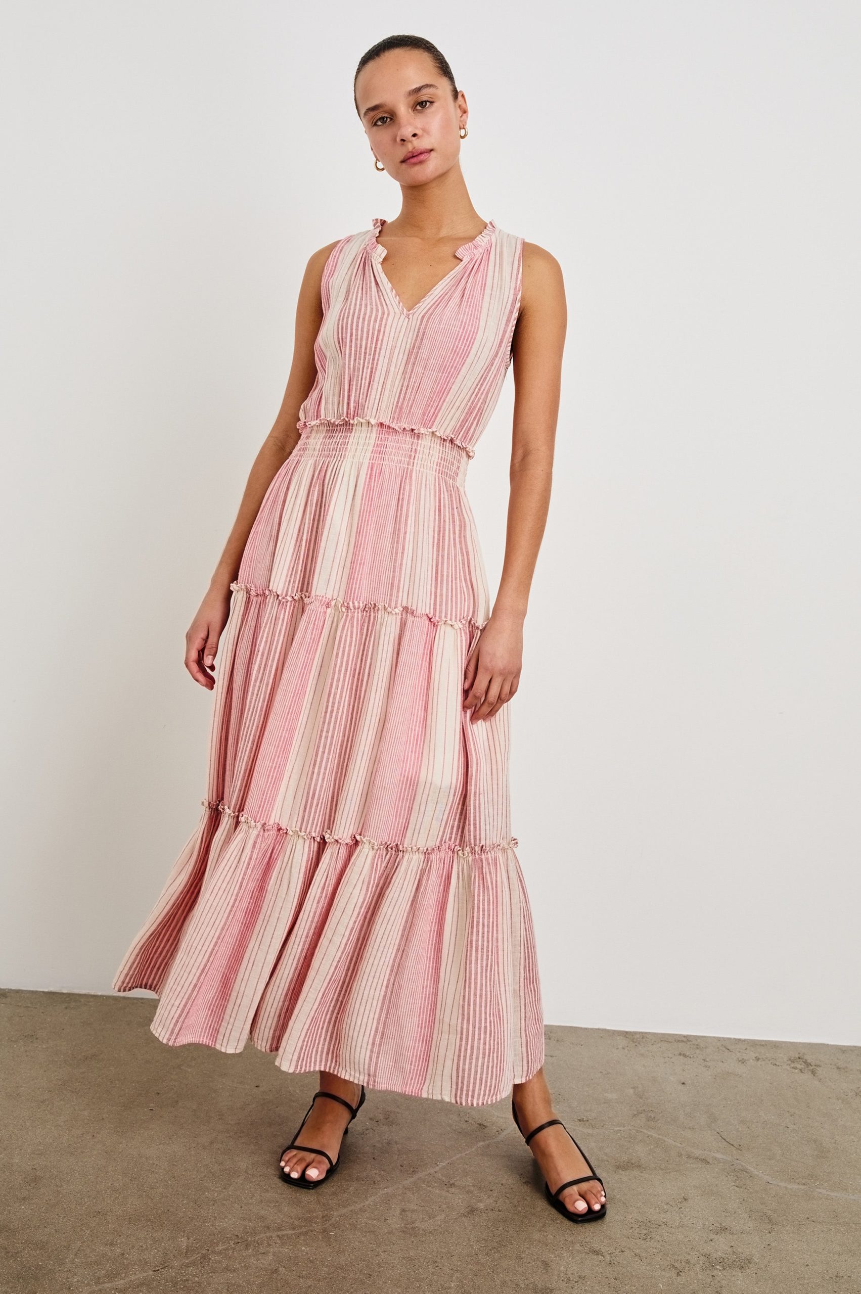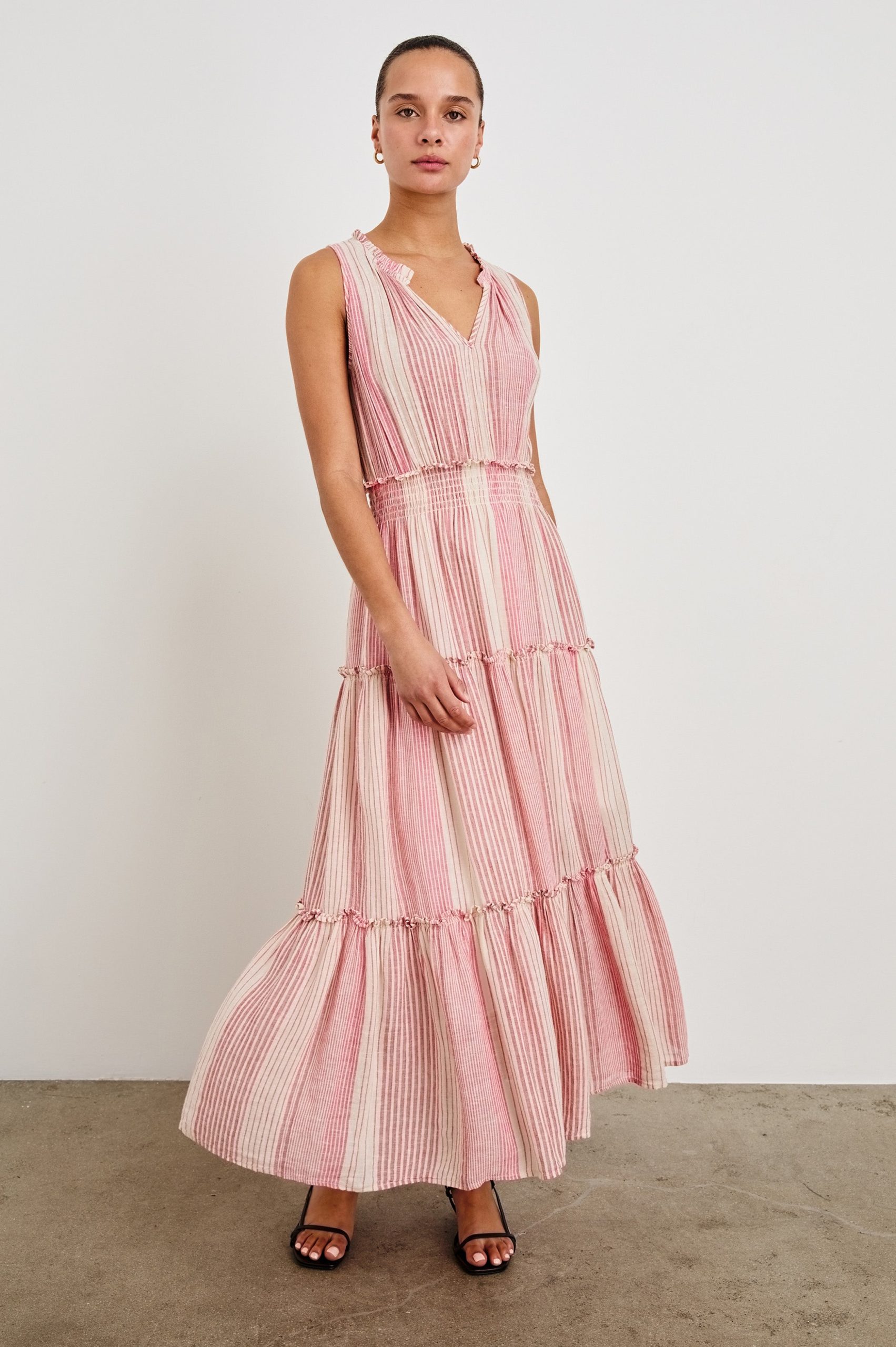 The Lou Lou is a luxe linen-blend dress with waist-cinching smocking. This maxi has a v-neckline and fully-lined skirt with ruffle detail at each tier.