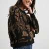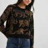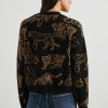 The Perci Sweater is made from ultra-soft wool alpaca blend. It's detailed with camel wild cats against a black background and features include a dropped shoulder, relaxed fit, and thick ribbed trim at the cuffs and hem.