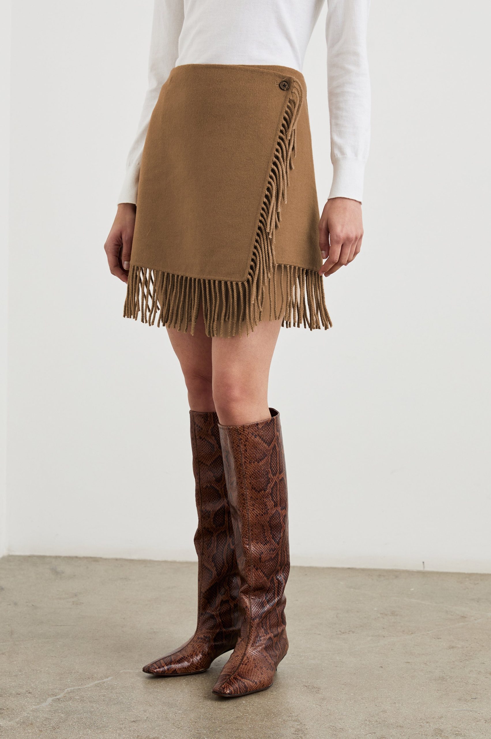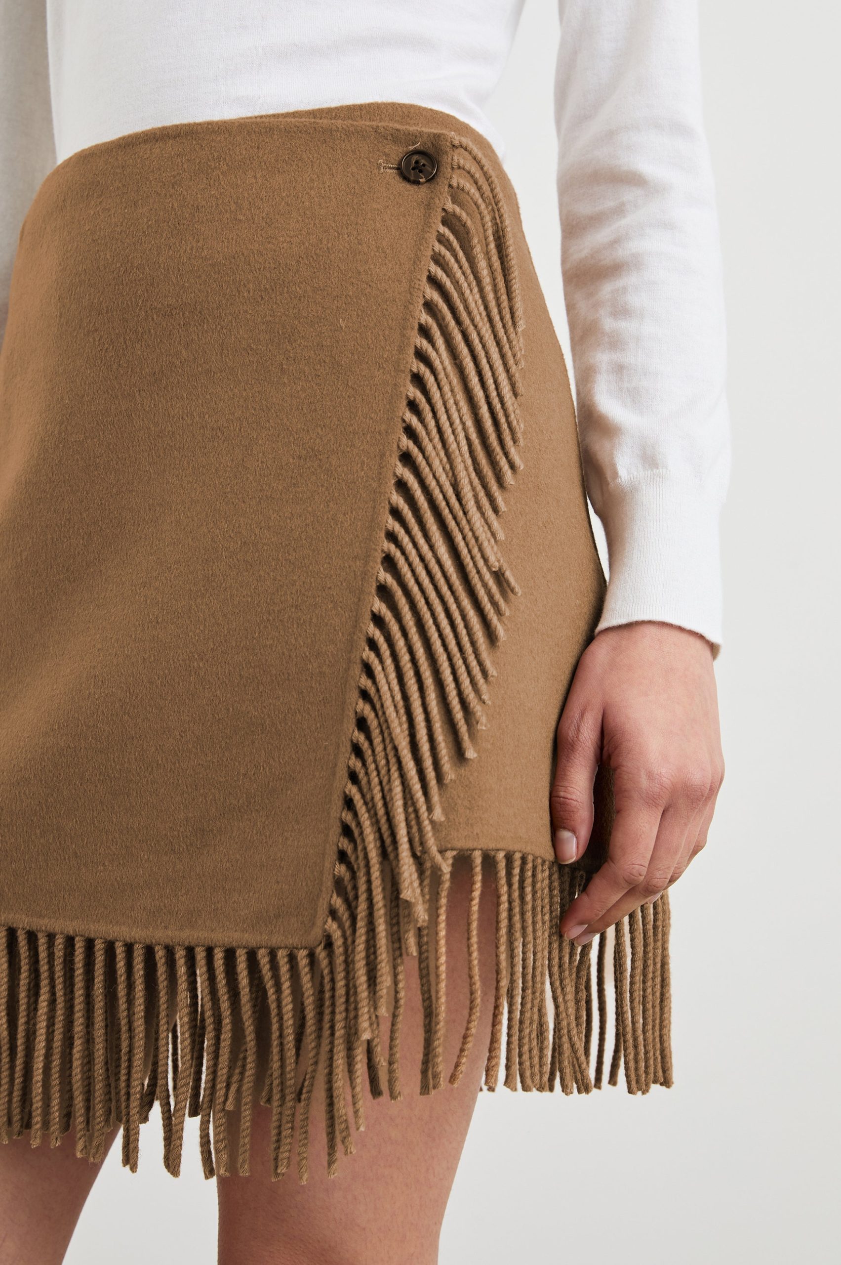 The Vista has an asymmetrical silhouette and tassel details, fabricated from double-faced heavy wool for warmth. Complete with an internal button, this statement skirt shines with your favorite basics or the matching Hugo Coat.