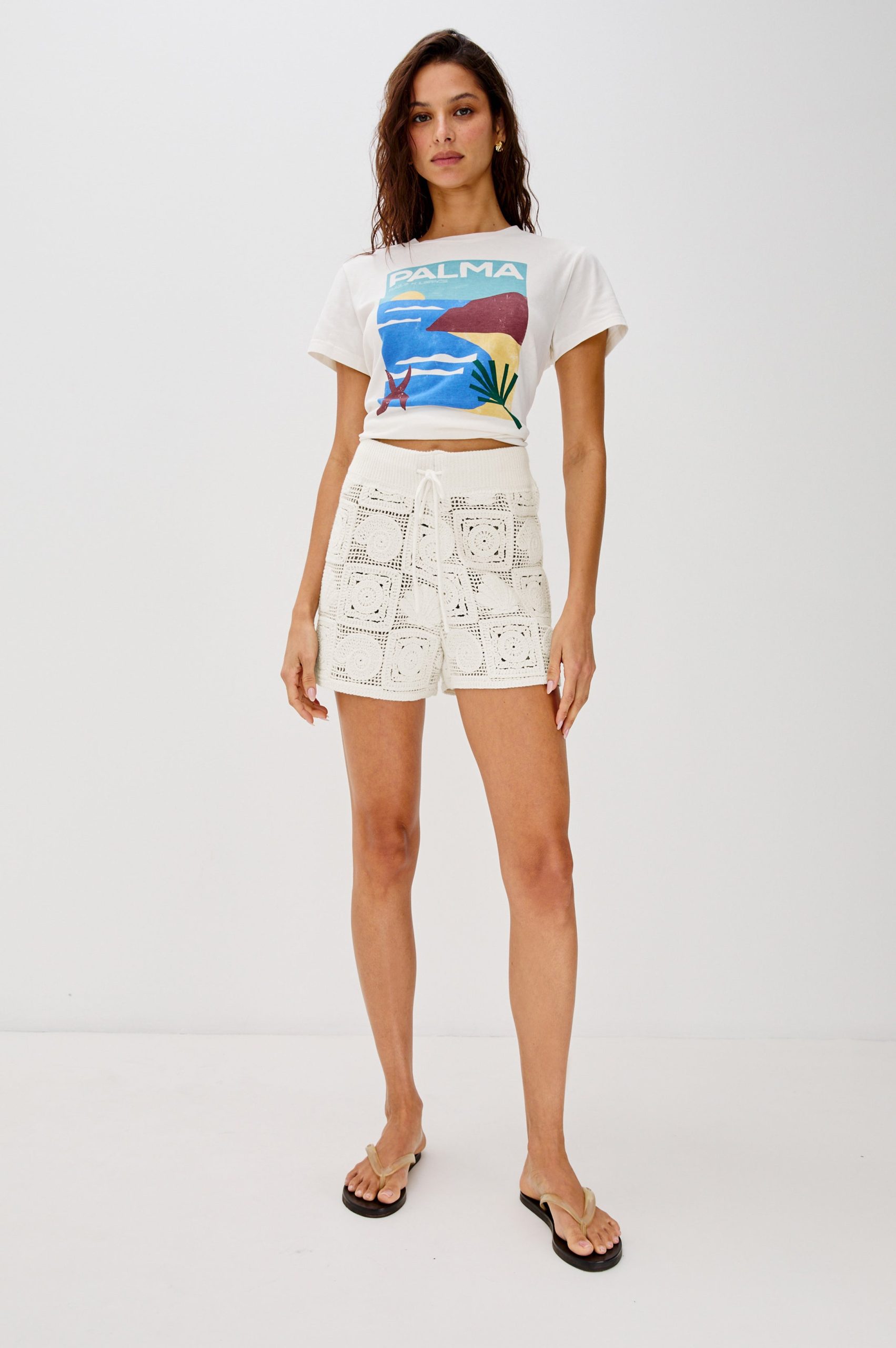 The Catalina Short features an open-stitch shell motif crochet design, a relaxed fit, and a drawstring waist. Pair it with the Paz Top for the ultimate set.